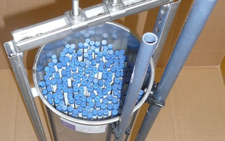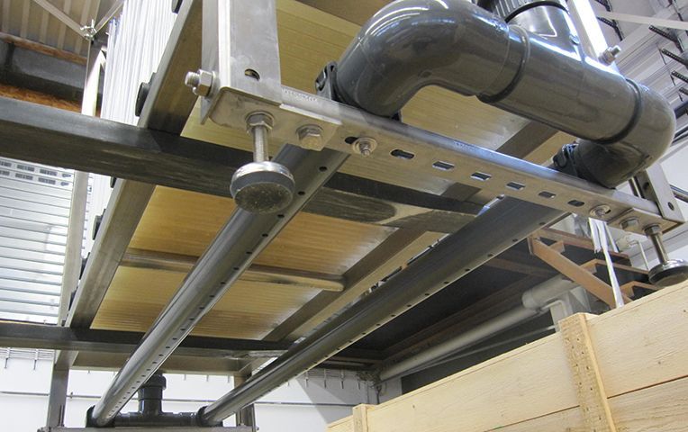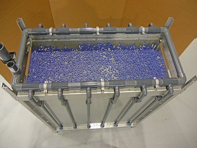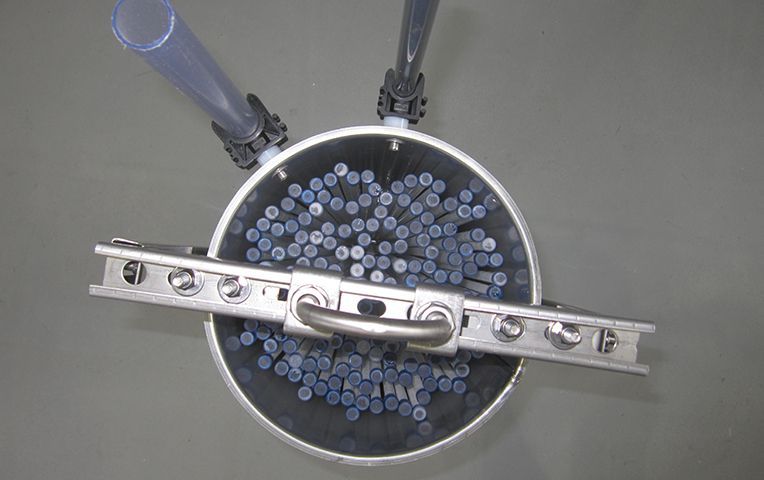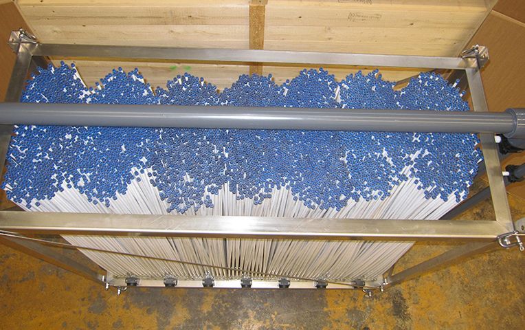 In membrane elements (ME-S) our tubular membranes are arranged vertically with exterior applied membrane coating (MEMTUBE-SUB) and on the other end potted in a permeate collector. The permeate collectors have ventilation slits to achieve a reliable flow of the air/sludge mixture. The upper end of the tubular membrane is closed individually and the membrane ends can move freely. Blocking the membranes with fibers and sludge can thus be reliably avoided.
